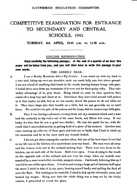The examination was in three parts, Arithmetic, English and an Intelligence Test and all were completed on the same day, as I recall. Pupils from my school, Harlow Green, sat the examination at Kells Lane School. We were allowed to keep the first two papers but the intelligence test was a worked-on paper. In the previous year, 1942, only the Intelligence Test was used to determine entrance and scholarship.